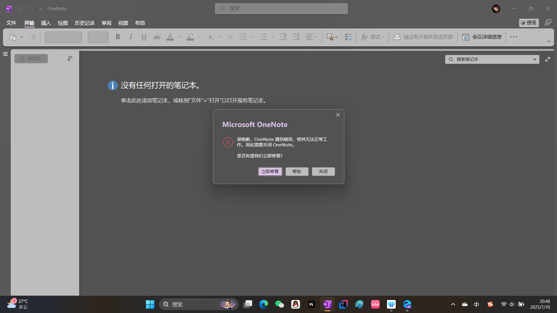 很抱歉,OneNote 遇到错误,使其无法正常工作。因此需要关闭 OneNote。